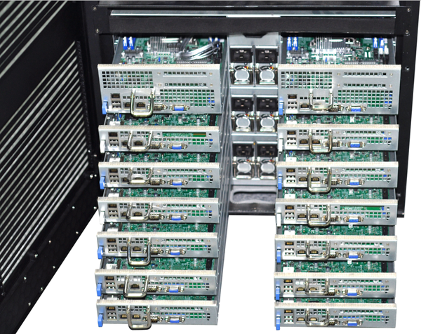 710公海赌船官网融合一体机就是解决环境使用问题而推出的综合性计算产品,它不需要专业的机房设施,不需要专业的配电和空调设备,放在办公室或实验室接墙电就可使用, 具有低噪音、低功耗等特点。最高可以安装14个双路XEON E5 处理器的刀片服务器,48个外置热插拔硬盘存储,内置一个万兆网络交换机安装空间,带有整体状态显示和控制系统,内部散热和防尘处理。专为办公室应用环境 设计,它在众多方面超越了传统机架式服务器、刀片服务器和机群服务器,是高稳定、高性能、低环境要求的新一代桌边型高性能计算机。它采用整体优化的设计, 有效降低了系统功耗,再加上其人性化的设计、很强的系统扩展能力、卓越的性价比和计算密度,可以覆盖更广泛的个人及工作组用户对高性能计算的需求,与传统 的高性能计算机相比,710公海赌船官网融合一体机可给予更有竞争力的整体解决方案,是更好满足中小高性能计算需求的理想平台。下图为14个刀片打开效果图:
