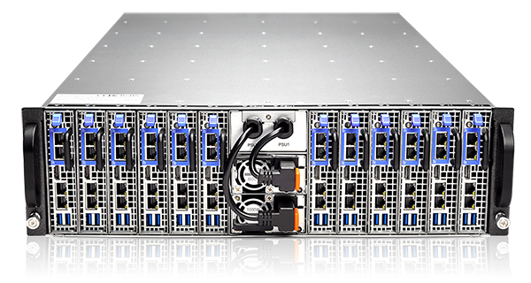 710公海赌船官网的S312-S24R刀片服务器集群系统3U机箱内包括12个E3 处理器刀片服务器,单个处理器带有2个视频处理核心,单个刀片可配置64G内存,2个6TB硬盘,整个系统可配置144TB存储容量,对建立基于云或 hadoop技术的视频处理系统,具有极高的性价比。服务器内部结构如下: